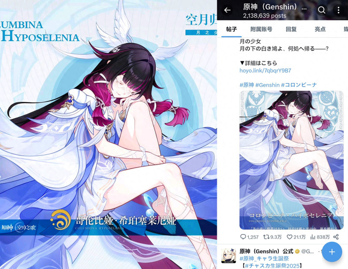 不得不说原神真是太顶级了!就在老米刚刚官宣了哥伦比娅的立绘之后,直接在外网引起了巨大反响!10分钟光速登顶日推热搜第一,立绘半小时超6w赞、110w阅读量!